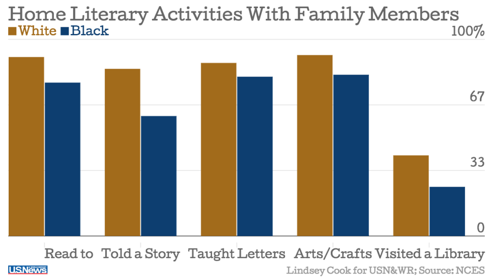 According to statistics, education between blacks and whites still isn’t equal because of its achievement gap. In these statistics, it provides possible factors that may contribute to the disparities and data in order to make the possible factors believable and then support their statement that education is still unequal and hasn’t changed. Some possible factors include, lower wealth, lower parental education levels, and lower health. For example, a white adult’s basic reading skill was 102 but of a black adult, it was 85. Also, 91% of white children aged 3 to 5 who weren’t enrolled in kindergarten were read to by family members three or more times per week, 78 % of black children were read to with the same frequency. This can then lead to fewer black children demonstrating proficiency in development skills like vocabulary, counting, colors, and shapes.16 % of black students drop out compared to 8% of white students which means that fewer black students graduate from high school and aren’t eligible for college enrolment.